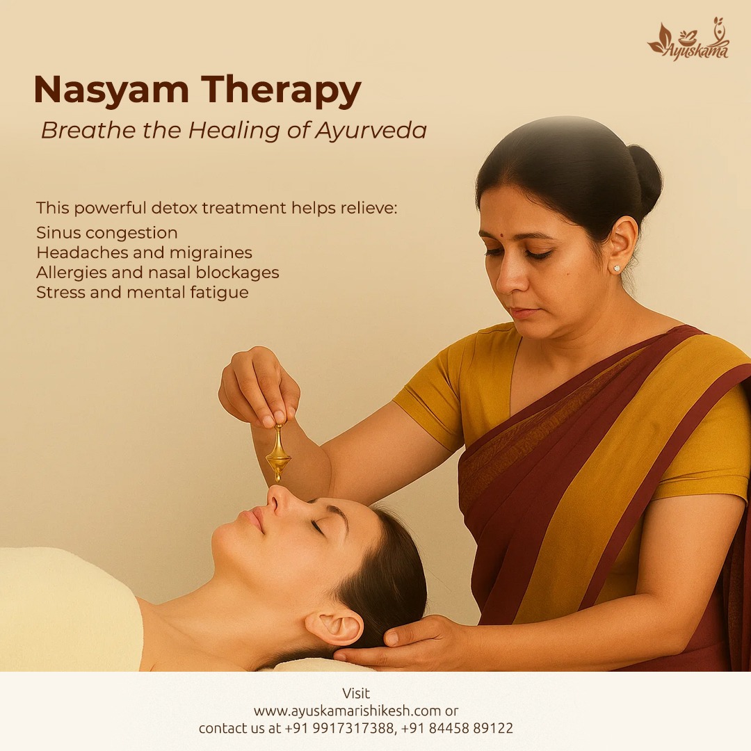 By Ayuskama Rishikesh In the ancient science of Ayurveda, Nasyam holds a sacred place as one of the Panchakarma therapies that rejuvenate the head, mind, and senses. At Ayuskama Ri